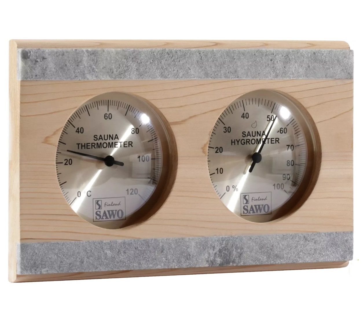 Термогигрометр 282-THRD от компании Sawo имеет классическую прямоугольную форму со скруглёнными углами. В широкой рамке из древесины кедра находится два круглых окошка. Под стеклом каждого окошка расположен графичный циферблат. Один из них - это гигрометр, который с точностью измерит уровень влажности в парной, другой - термометр, который сообщит о температуре воздуха.