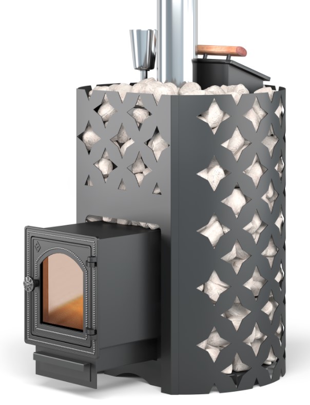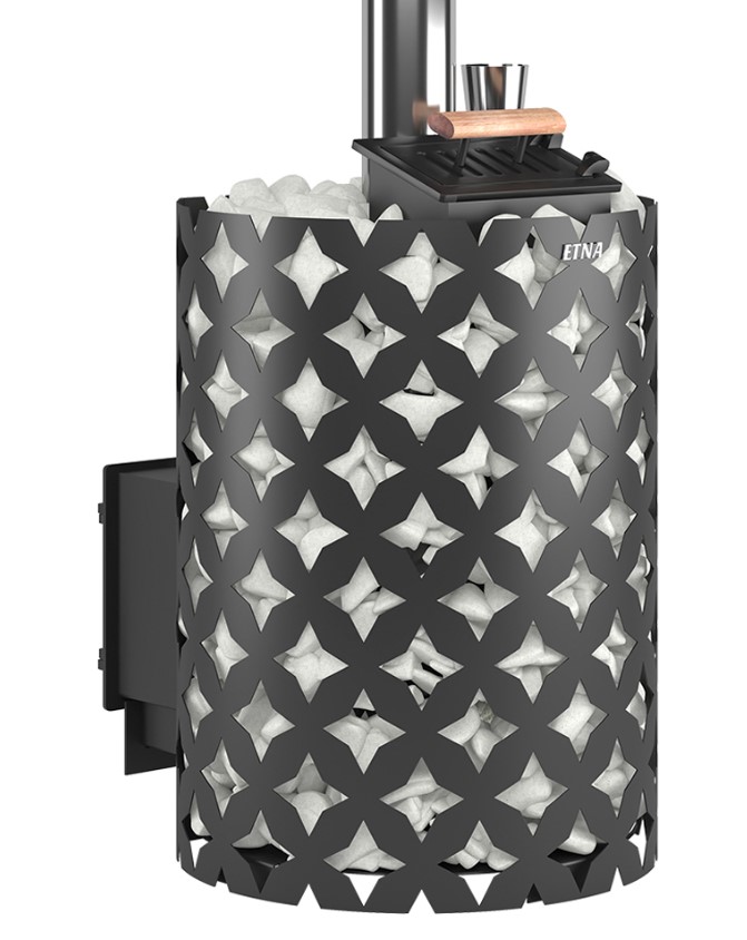 Для устройства наружной открытой каменки печь ЭТНА ЗК 18 оснащается металлическим кожухом с прорезным рисунком оригинального дизайна. Пространство между печью и кожухом из двухмиллиметровой стали заполняется камнями для бани, которые выполняют роль теплонакопителя, перераспределяют тепло от стенок топки и защищают парящихся от жёсткого инфракрасного излучения. Воду подают на нагретые камни, с которых полученный пар распространяется по всему объёму парной. Кожух диаметром 560 миллиметров вмещает в себя до 110 килограммов камней крупной и средней фракции.