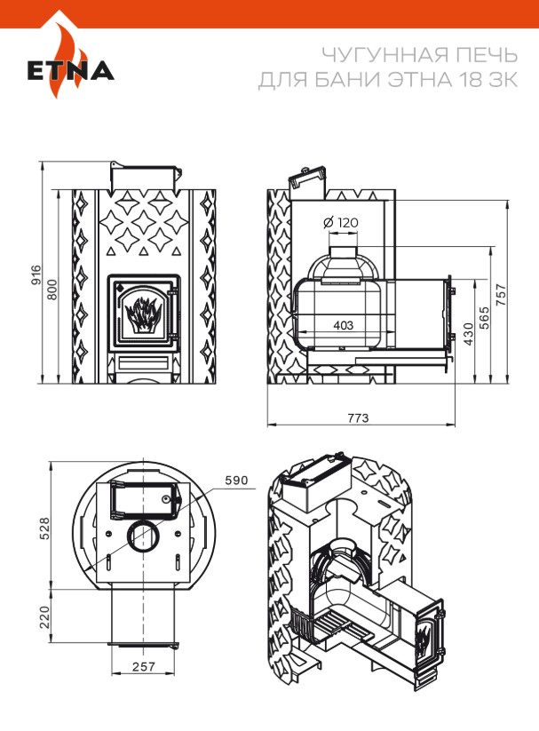 Банная печь ЭТНА ЗК 18 ДТ-4С изготовлена из чугуна высокого качества. Материал с высокой теплопроводностью, чугун быстро передаёт энергию сжигаемого топлива наружу, в пространство парной. Толщина деталей корпуса составляет 6-8 миллиметров.