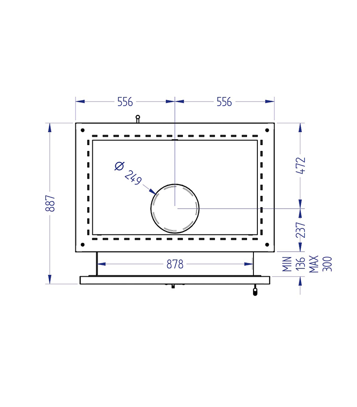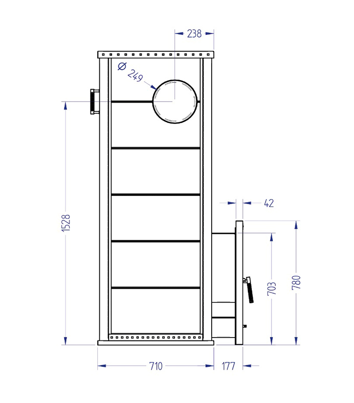 Печь снабжена раздвижным тоннелем для установки в простенок с разной толщиной стен. Подключение к дымоходу может быть осуществлено с трех сторон: слева, справа, сверху. Дверца с большим смотровым стеклом позволяет любоваться огнем как у полноценного камина.