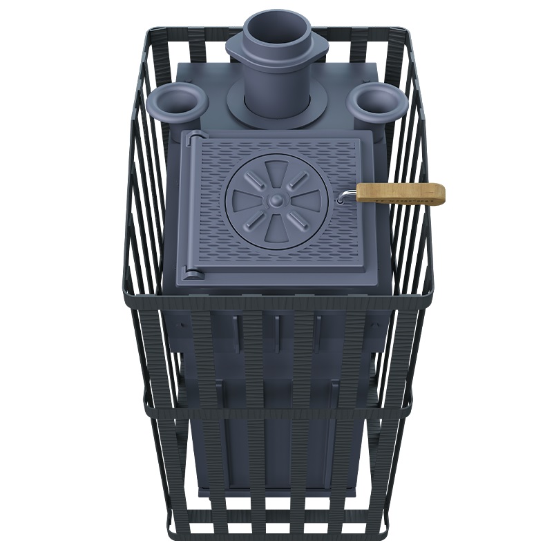 Модель GROZA выполнена на базе топочного агрегата - экономичная модель для частного применения. Основной принцип работы печи сохранён – получение пара с теплоёмкой каменки прямого нагрева. Каменка является сводом топки, нагревается с нижней поверхности снабженной теплосъемными шипами для увеличения контакта с пламенем.