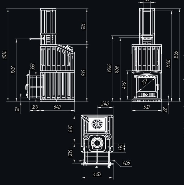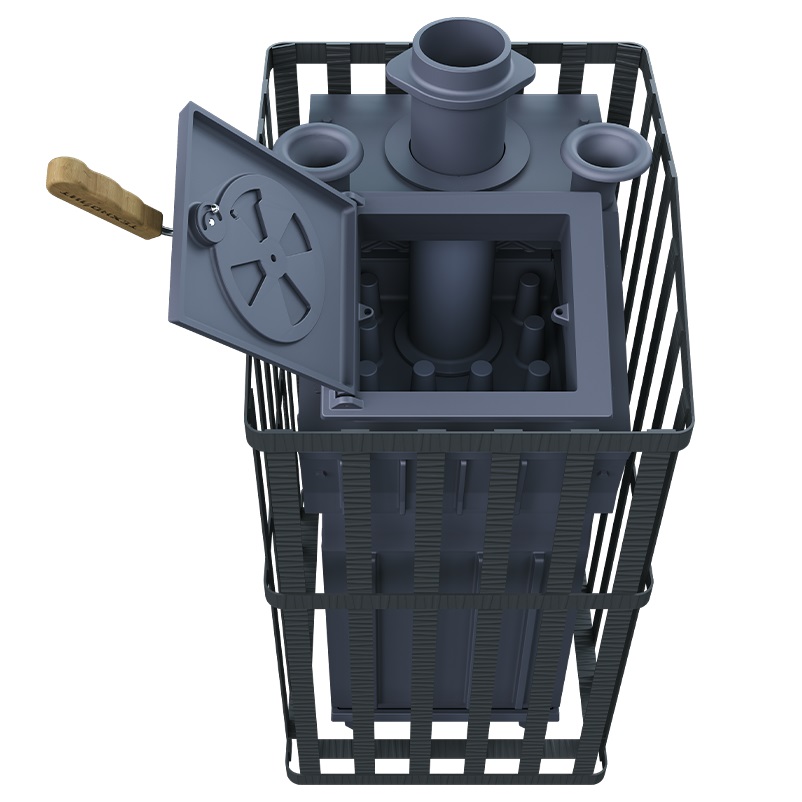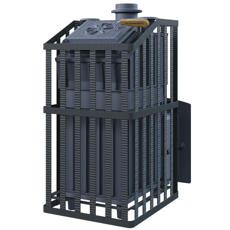Печь для бани Гроза 24 (П)2 Ураган - расширенный комплект печи в сетке. Максимально приближенный вариант печи для режимов русской парной, имеющий непосредственно закрытую чугунным коробом каменку, дверцу для пара с ручкой из бука, увеличенную до 50 см чугунную стартовую трубу. Печь легко модернизируется до полноценной печи предназначенной для Русской бани путем замены стальной сетки на каменную облицовку без демонтажа дымохода.