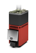 Нагрев камней в печи Теплодар Русь 12 Л происходит за счёт самой раскалённой её части – дымосборника. Вокруг него выкладываются камни, что позволяет быстро и хорошо их прогревать. Данная модель славится также тем, что за счёт своей уникальной конструкции она минимизирует нагрузку на коллектор камней и тем самым способствует их ещё более качественному прогреву. Печь имеет великолепный эргономичный дизайн, закруглённые углы, для большей безопасности в парной, и жаростойкую, автономно охлаждаемую дверцу. Данная каменка очень легка в установке благодаря тому, что выход дымовой трубы расположен в центре.