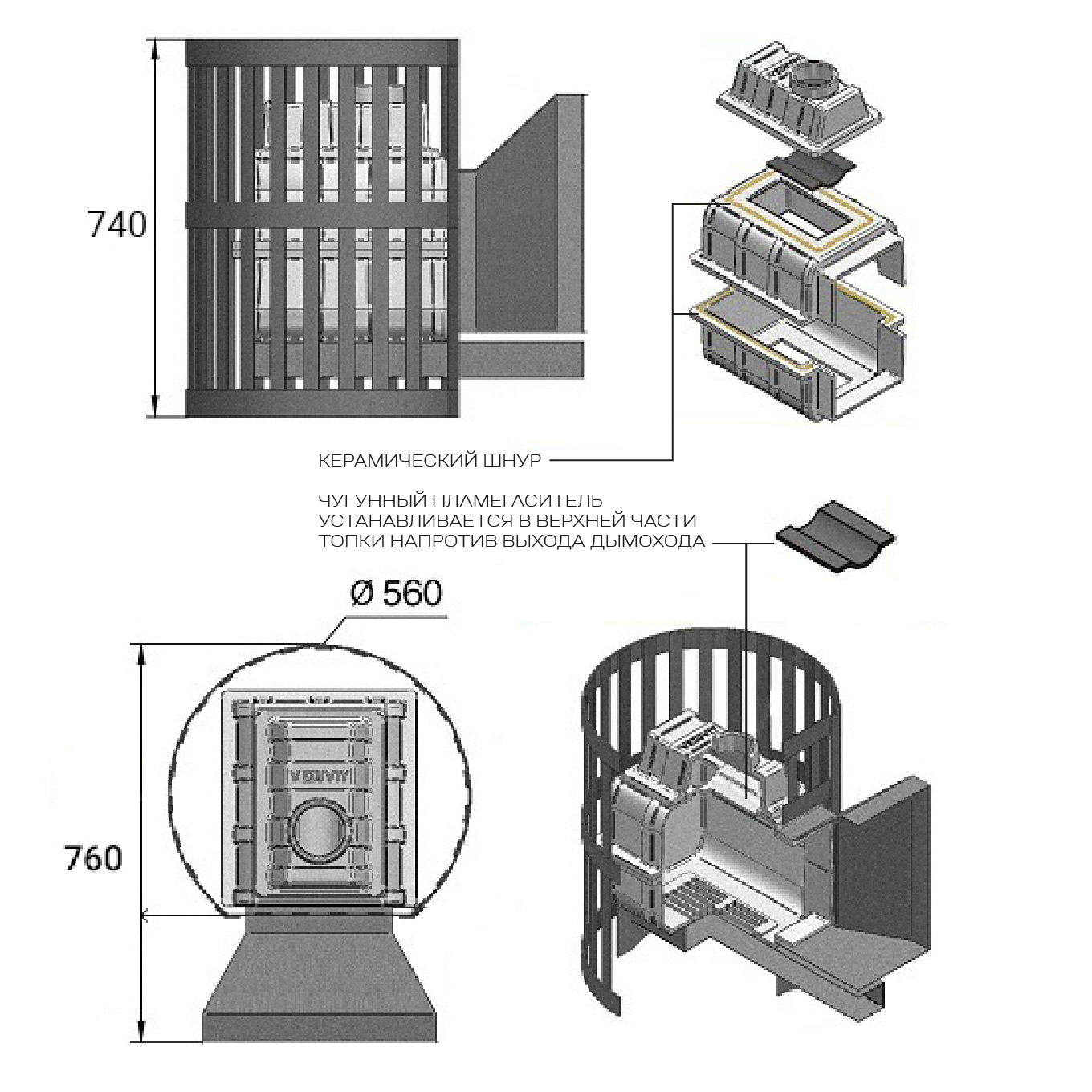 Преимущество печи в том, что топка печи состоит из 3-х элементов. На стыке между ними используется керамический шнур с рабочей температурой 1200 градусов. То есть топка печи абсолютно герметична! Для фиксации деталей между собой применяется болтовое соединение, что даёт 100% гарантию безопасности при эксплуатации.