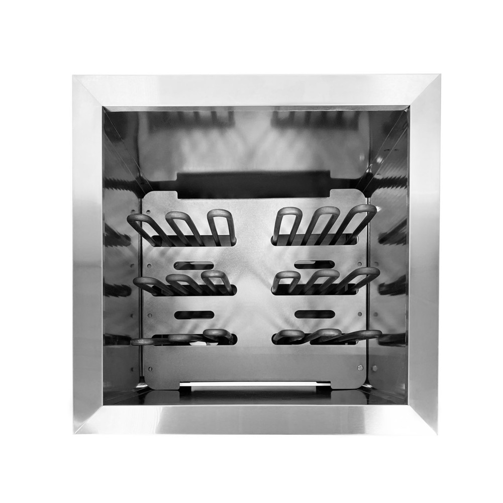 Нагревательный элемент в электрокаменках представлен в виде ТЭНа. Это проверенный годами элемент, материалом в котором выступает специальная нержавеющая сталь. Основными характеристиками нагревателя является большая тепловая инерция, влагоустойчивость, электробезопасность и абсолютная безопасность при попадании воды на поверхность нагревательного элемента. Именно поэтому модели печей можно использовать и в финской бане, и в традиционной русской – камни, находящиеся в печи можно безбоязненно поливать водой, не боясь повредить внутренние детали и залить их водой.