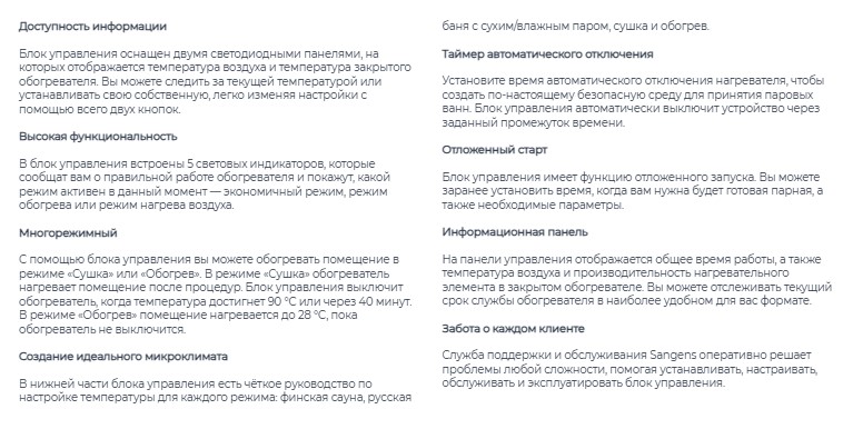 В блок управления встроены: таймеры максимальной длительности работы и таймер отложенного старта. В приложении предусмотрены готовые режимы работы, также есть возможность установки любых комфортных температурных режимов.