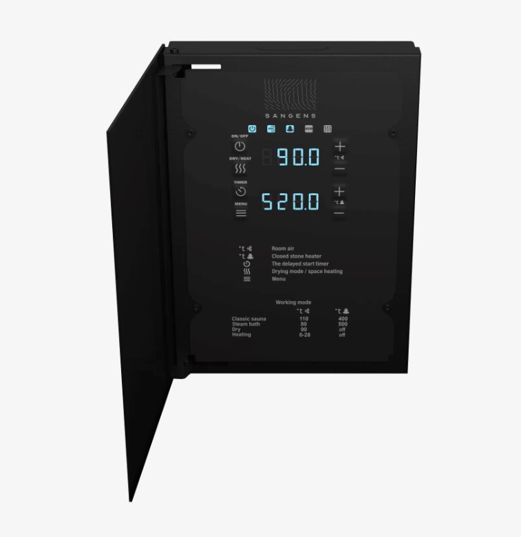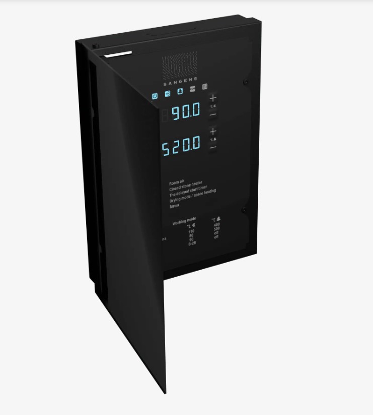 Настройка выполняется при помощи кнопок на передней панели блока. Для индикации используются 2 LED дисплея. Диапазон регулировок: Т закр. каменки: 300-580°C, Т возд.: 0-120 °C.