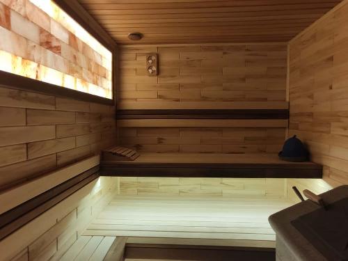 Небольшая уютная парная собрана из экологичных и натуральных материалов. Для стен использована фактурная паркетная вагонка, потолок выполнен из канадского кедра. Кедр при нагревании выделяет в воздух эфирные масла, обладающие антибактериальными свойствами. Такой пар способен оздоровить организм и укрепить общий иммунитет. Печь «Гефест» в облицовке из талькомагнезита установлена возле стены из талькохлорита «рваный камень». Максимальный уровень комфорта обеспечивают парящие полки из двух видов липы: липа экстра + термолипа. А панно из гималайской соли наполняет парную мягким тёплым светом.