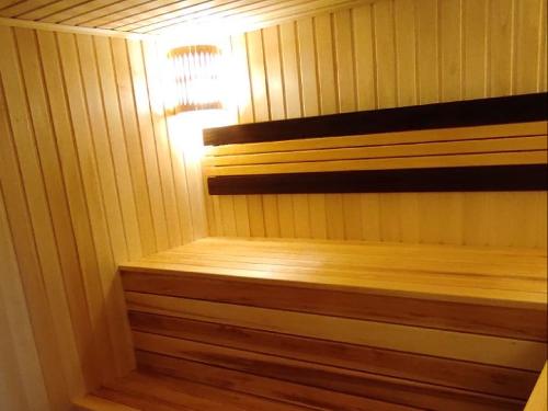Потолок и стены выполнены из высококачественной липы сорта А/Э. Полки – из текстурированной липы. Сочетание этих двух разновидностей липовой древесины создает натуральный и эффектный вид. Изысканности интерьеру добавляет термо липа, использованная в окантовке подспинников.