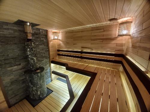 Для обогрева помещения установлена дровяная печь «Ферингер», которая создаёт лёгкий и жаркий, расслабляющий и оздоравливающий пар. Печь облицована наборными ламелями из змеевика. Змеевик останавливает жёсткое ИК излучение, а высокая теплопроводность камня позволяет эффективно распределять тепло внутри парной.
