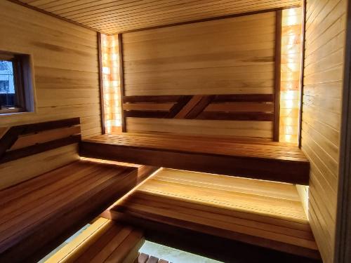 Светильники расположены за плитками из гималайской соли – такое решение создает приятное мягкое освещение. Кроме того, гималайская соль известна своими целебными свойствами, которые способствуют релаксации и улучшению здоровья.