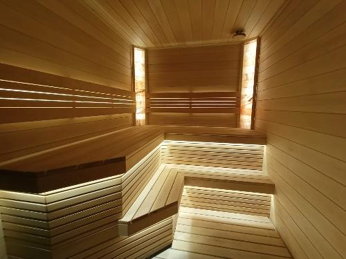 Интересный акцент в интерьер парной добавляет освещение – оно расположено за полками, подспинниками и в виде подсветки соляного панно. Такое решение создает более мягкий свет, который способствует дополнительной релаксации.