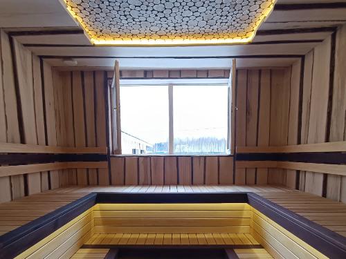 Подсветка установлена под полками и по периметру можжевелового панно на потолке. Большие окна пропускают естественный свет и позволяют наслаждаться природными видами во время парения.